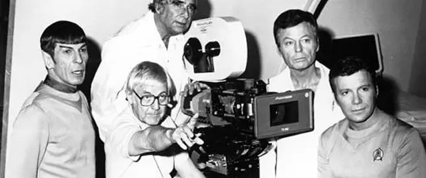 大雷:步履蹒跚的!在银幕上步履蹒跚,如果丢掉几磅肉就会更干练了。但我们没能得到机会。所以那就是星际迷航作为电影的完结。一切都结束了,他们经济上遭受了损失,至少那个时候是的,虽然我了解到电影后续还是赚到了钱。不过那时候一切都结束了。但那时候制片公司的老板,我试图想起他的名字,他的妻子和他说,星际迷航那么好,你们得再拍一部。这位老板,他只是老板,并不是公司的负责人,就说,我们要再拍一部。然后他们找来了一位电视制作人,哈维·贝纳特,因为他说我可以花很少的钱。他确实做到了。那促成了第二部电影的启动,我们那时候以为第二部会是最后一部了。之后每一部星际迷航电影,我们都以为是最后一部,结束的时候他们都会把布景烧掉。没有理由留着复原,因为不会再有下一部了。所以他们就全烧了。